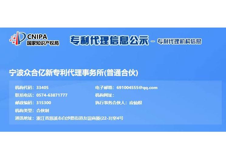 浙江億新知識(shí)產(chǎn)權(quán)服務(wù)有限公司前身為慈溪眾合知識(shí)產(chǎn)權(quán)代理事務(wù)所,創(chuàng)始于2004年,為了服務(wù)更多的創(chuàng)新企業(yè),實(shí)現(xiàn)“服務(wù)億萬(wàn)創(chuàng)新企業(yè)”的理念,后更名為浙江億新知識(shí)產(chǎn)權(quán),旗下公司包括:寧波眾合億新專(zhuān)利代理事務(wù)所(機(jī)構(gòu)代碼33405)、中范(北京)認(rèn)證有限公司。其中寧波眾合億新專(zhuān)利代理事務(wù)所是慈溪市科技服務(wù)聯(lián)盟理事單位,前灣區(qū)知識(shí)產(chǎn)權(quán)工作站。公司位于浙江省慈溪市文化商務(wù)區(qū)友誼商廈,并在北京、青島設(shè)有辦事處。